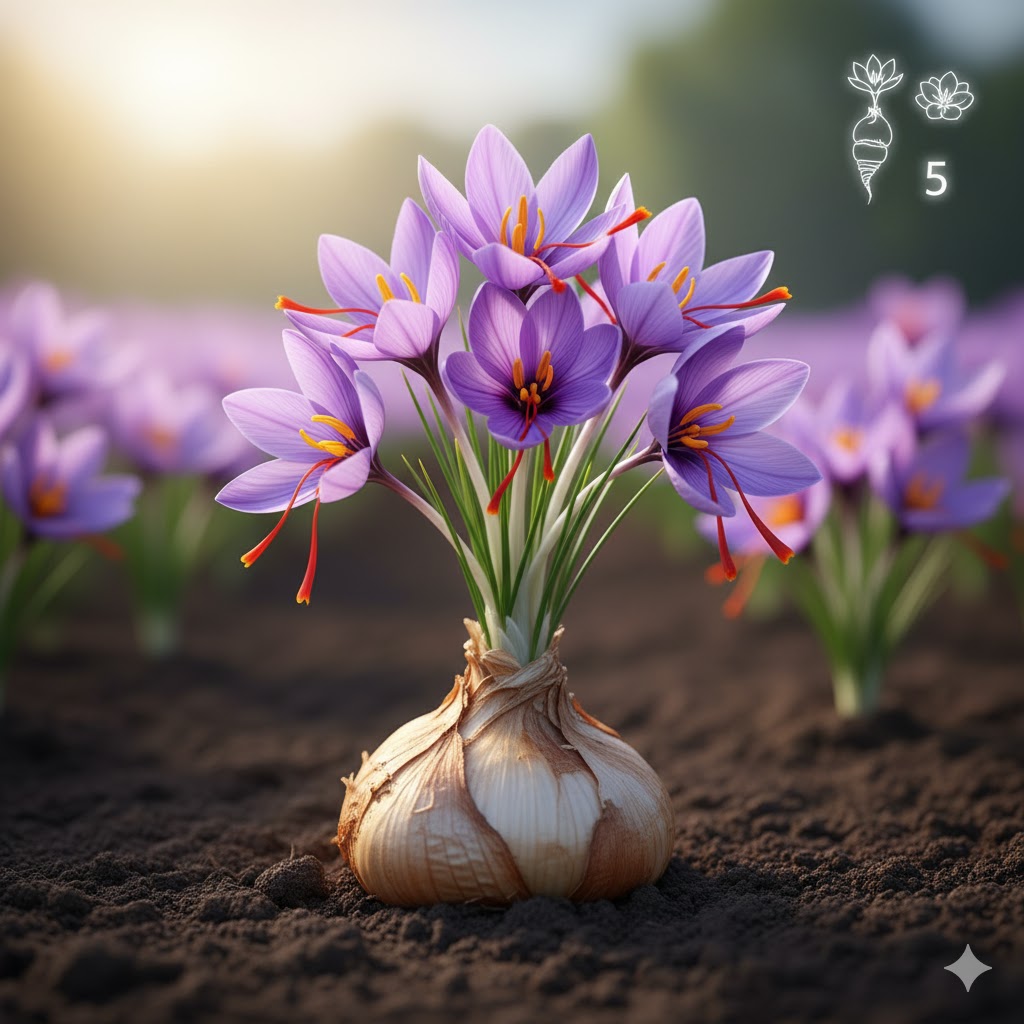 هر پیاز زعفران به طور میانگین بین ۳ تا ۵ گل تولید میکند که البته این عدد قطعی نبوده و بسته به اندازه پیاز، سن آن، کیفیت خاک و . . .